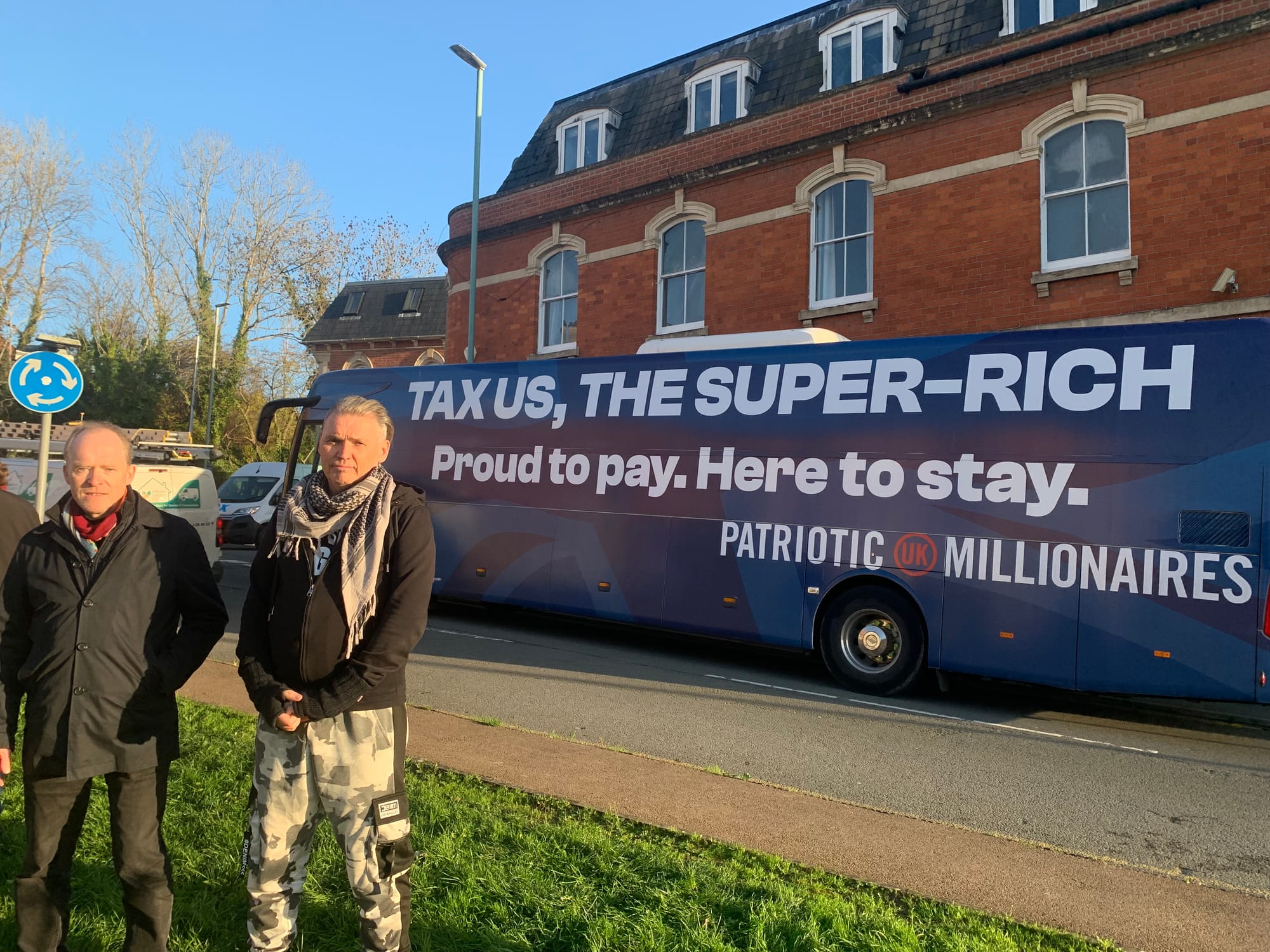 The Patriotic Millionaires UK (PM UK) campaign bus stopped outside the offices of Ecotricity on the 17th November to talk to people about their calls for a wealth tax. Robin Layfield lead an interview with local Patriotic Millionaire and founder of Ecotricity, Dale Vince.